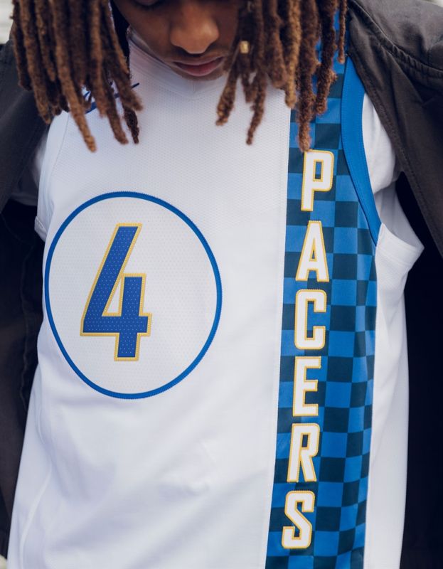 球衣上深淺不一的方格條紋象徵著連結當地經典賽車文化與球隊現代精神。藍色與金色的色彩組合則取自印第安納州的州旗。