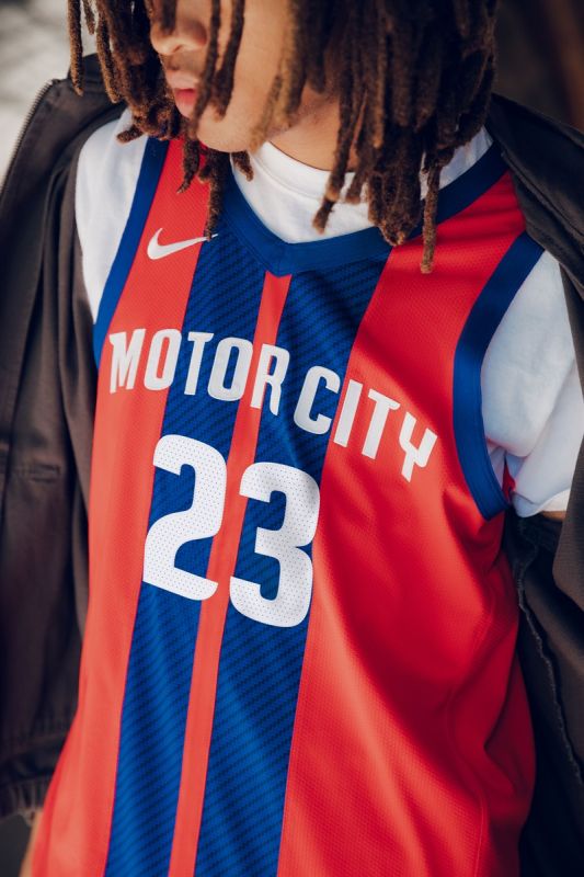 底特律的城市版球衣以象徵著賽道的紅藍條紋,進一步傳遞出汽車之城的文化蘊涵。