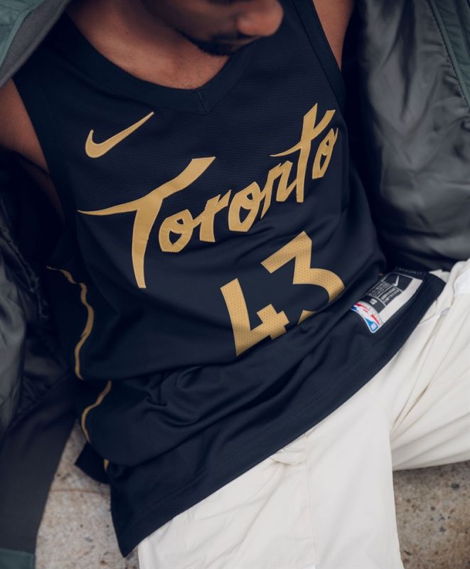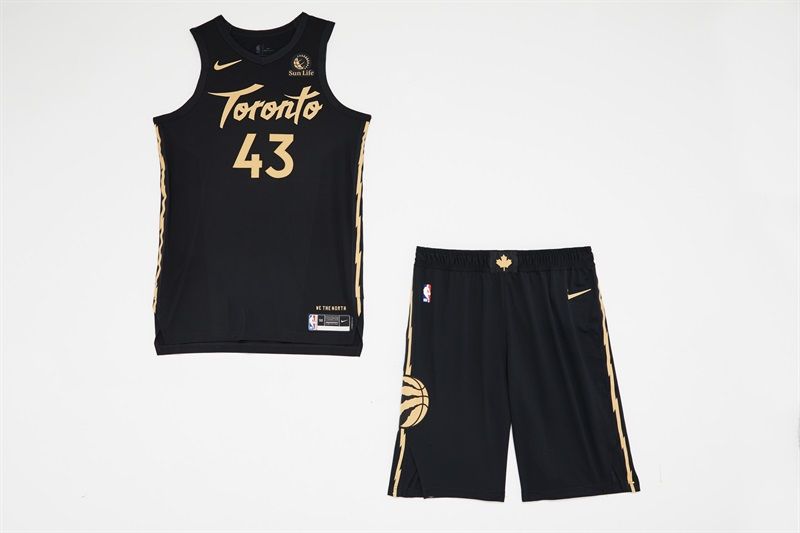 以黑色與金色為主色調的配色設計,靈感源自塑造了這座城市當地的籃球文化及特色族群。橫貫前胸的“Toronto”則使用了與經典款球衣上“Raptors”相同的字體。