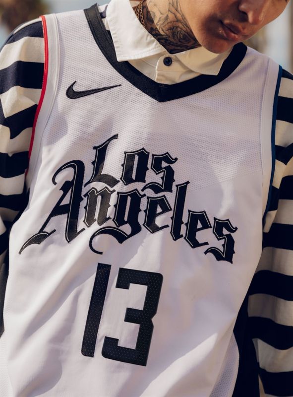 球衣以白色為主色,胸前印有以洛杉磯當地西岸刺青藝術為靈感的華麗“Los Angeles”字樣。