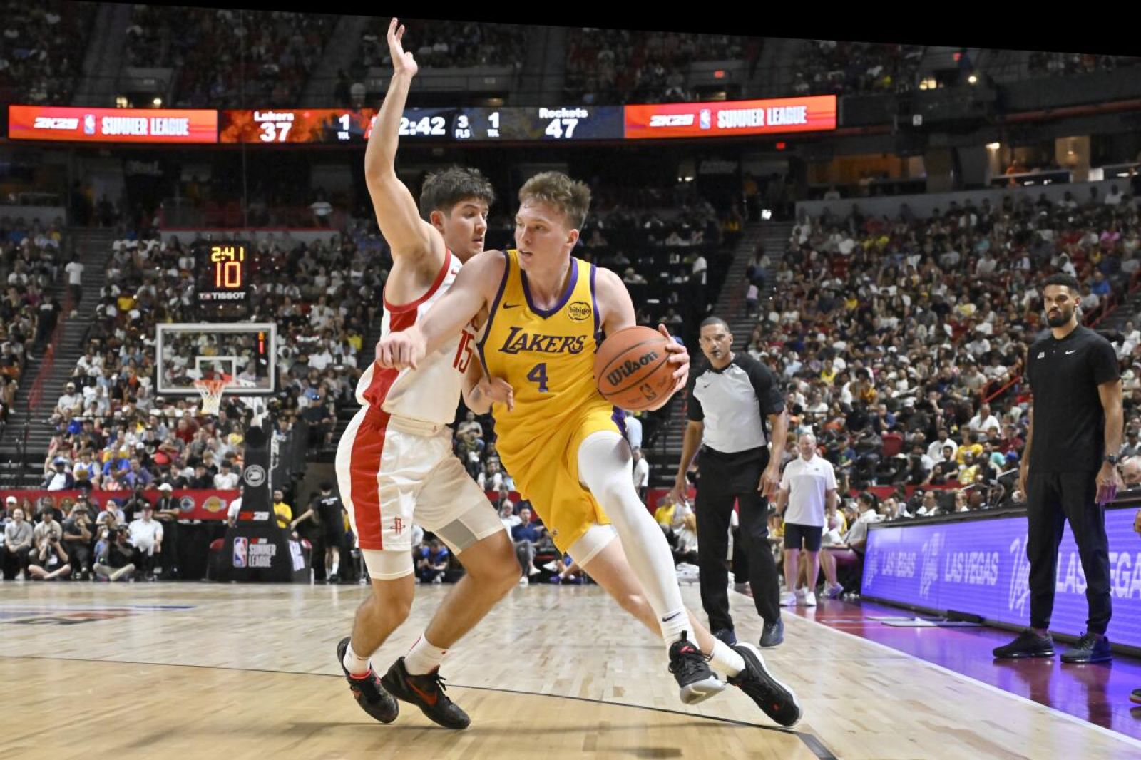 今天湖人隊在拉斯維加斯夏季聯賽首戰對上拿到探花籤的火箭隊,這場也吸引了大量的球迷來到現場觀賽,火箭隊的探花新秀Reed Sheppard這場外線表現如同選秀前預測,外線6投4中,全場得到23分,率領球隊力壓湖人拿下勝利。