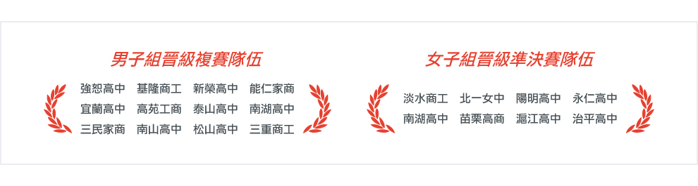 | 男子組四強名單 | 女子組四強名單 | ||||||||||||||||||||||||||||||||||||||||||||||||||||||||||||||||||||||||||||||||||||||||||||||||||||||