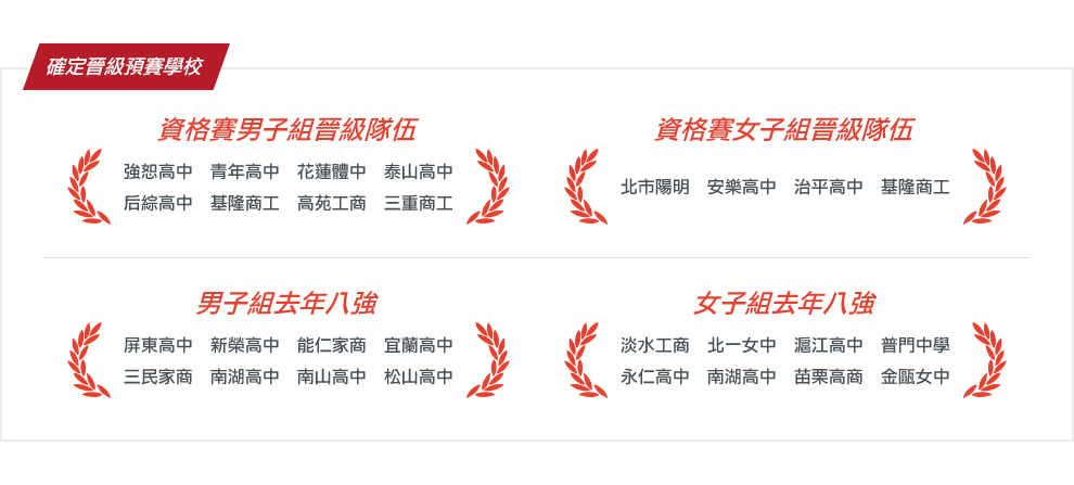 | 確定晉級預賽學校 | |||||||||||||||||||||||||||||||||||||||||||||||||||||||||||||||||||||||||||||||||||||||||||||||||||||||